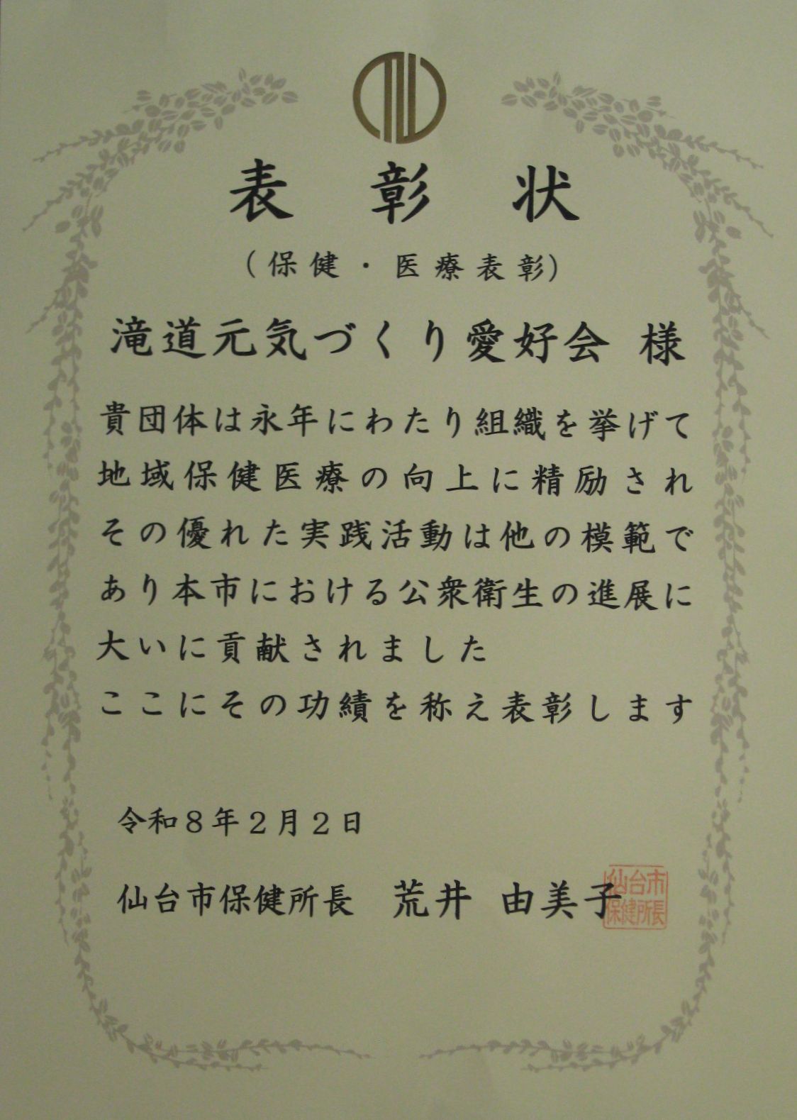 滝道元気づくり愛好会 表彰される 掲載日:2026/03/27 開催日 2026/02/02 イベント サークル 投稿者 富樫貞雄 撮影者 富樫貞雄 拍手を贈る 2月2日(月)オンワード樫山仙台ビルに於いて、「仙台市保健所公衆衛生関係功労者等表彰式」がありました。これは、長年にわたり公衆衛生の向上に寄与した功績に対し、仙台市が毎年特定の個人や団体を表彰しているものです。 今回個人13名、30団体表彰中、当町内からは全9種類の表彰対象の内、保健・医療表彰(地域保健医療)で、毎週水曜日に活動されている「滝道元気づくり愛好会」(代表:榎本章子さん)が団体表彰されました。おめでとうございます。これからも長く続けて、会員の健康維持と親睦を図ってください。 3 拍手を贈る 投稿ナビゲーション ふれあいパーク球根植社協サロン開催